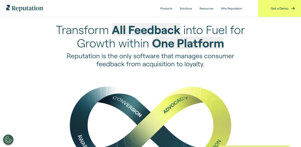 Reputation’s platform manages customer feedback from acquisition to loyalty, using surveys, review monitoring and responses, and a ticketing system that captures customer comments, speeds up customer communication, and reduces unresponsiveness.