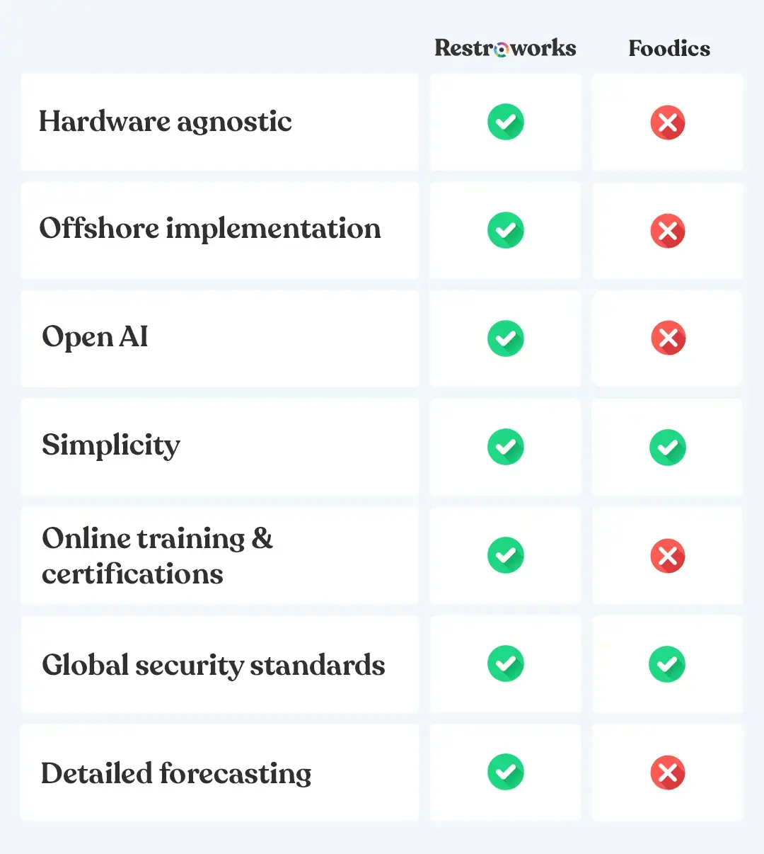 Restroworks offers a superior level of versatility and scalability compared to Foodics. Its robust architecture and customizable features make it adaptable to the evolving needs of any restaurant, whether it's a small independent eatery or a large restaurant chain. Additionally, Restroworks prioritizes operational efficiency and seamless integration across various restaurant functions, providing a holistic solution for restaurant management.