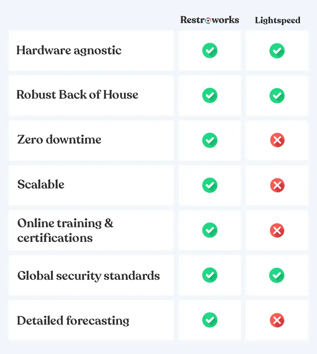 Restroworks is built with scalability in mind, making it suitable for restaurants of all sizes, from small cafes to large chains. Its flexible architecture and customizable features ensure that it can grow with your business and adapt to changing needs. On the other hand, while Lightspeed may be suitable for smaller establishments, it may struggle to meet the demands of larger, more complex restaurant operations. |