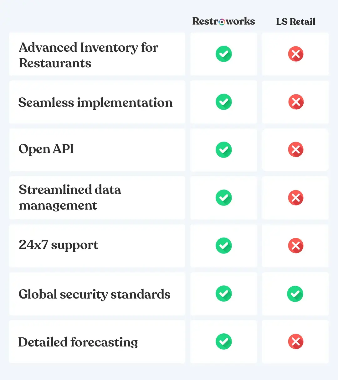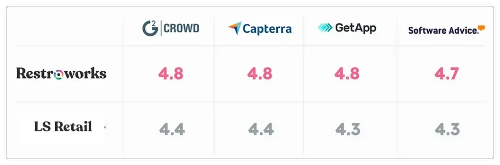 Restroworks excels beyond LS Retail by offering seamless implementation with quick offshore rollouts and a dedicated training platform, further elevated by around-the-clock support that achieves a remarkable 99.23% customer satisfaction rate.This ensures a smooth start and continuous support for greater efficiency